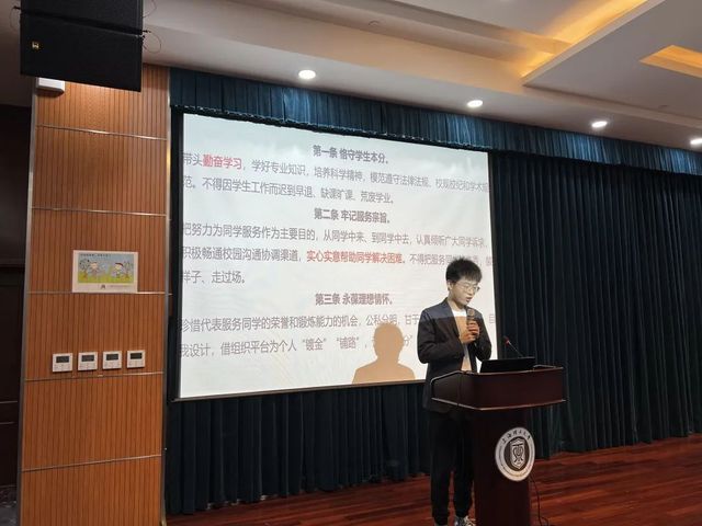 胡恩鍇團副以《關(guān)于學聯(lián)學生會改進作風服務(wù)同學的若干規(guī)定》為綱要,提出了恪守學生本分:帶頭勤奮學習,學好專業(yè)知識,培養(yǎng)科學精神,模范遵守法律法規(guī)、校規(guī)校紀和學術(shù)規(guī)范。牢記服務(wù)宗旨:把努力為同學服務(wù)作為主要目的,從同學中來、到同學中去,認真傾聽廣大同學訴求,積極暢通校園溝通協(xié)調(diào)渠道,實心實意幫助同學解決困難。永葆理想情懷:珍惜代表服務(wù)同學的榮譽和鍛煉能力的機會,公私分明,甘于奉獻。勤勉務(wù)實做事:把讓廣大同學滿意作為工作目標,扎根同學、勤奮工作、求真務(wù)實,力戒模仿行政化工作方式。營造平等氛圍:牢記自己的首要身份是學生,牢記學聯(lián)學生會工作的本質(zhì)是群眾工作,彼此互相幫助、平等相待。摒棄庸俗習氣:努力建設(shè)充滿朝氣、干凈純粹的組織文化,堅決抵制社會不良習氣侵蝕的六項重要要求。