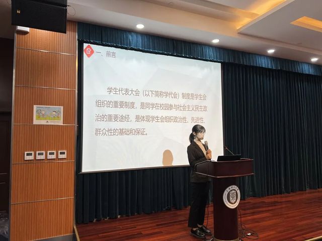 華宇婷主席從制度出發(fā),貫徹學生會組織的政治性、先進性、群眾性,落實七項主要目的,分25步具體講解了如何開好一次學代會。